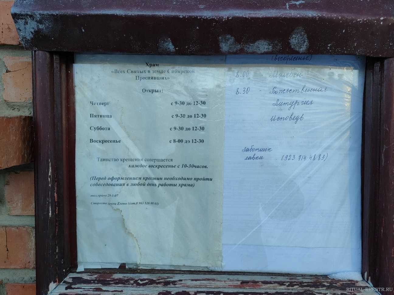 Храм Всех Святых в земле Сибирской Просиявших расположен по адресу Алтайский край, пос. Комсомольский, Московская улица, 1а. Храм является ближайшей православной церковью в этом районе. Режим работы храма следующий: с понедельника по пятницу с 8:00 до 18:00, в субботу и воскресенье с 9:00 до 17:00. В храме проводятся панихиды и поминальные службы по усопшим. Чтобы заказать панихиду, можно сделать это онлайн на сайте храма. Стоимость панихиды в церкви зависит от выбранного варианта и услуг, подробности можно узнать по телефону. Храм Всех Святых готов принять вас и оказать помощь в организации панихиды или других религиозных служб.